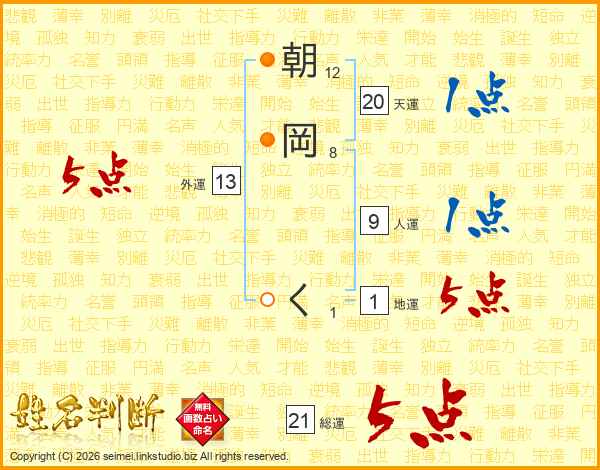 生活面を象徴する運勢です。外部から受ける影響力を表し、結婚運、家庭運や職場、環境への順応性を表します。総運から人運を引いた画数。姓や名が1文字の場合を除く。