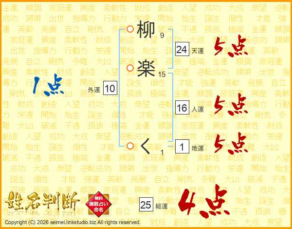 生活面を象徴する運勢です。外部から受ける影響力を表し、結婚運、家庭運や職場、環境への順応性を表します。総運から人運を引いた画数。姓や名が1文字の場合を除く。