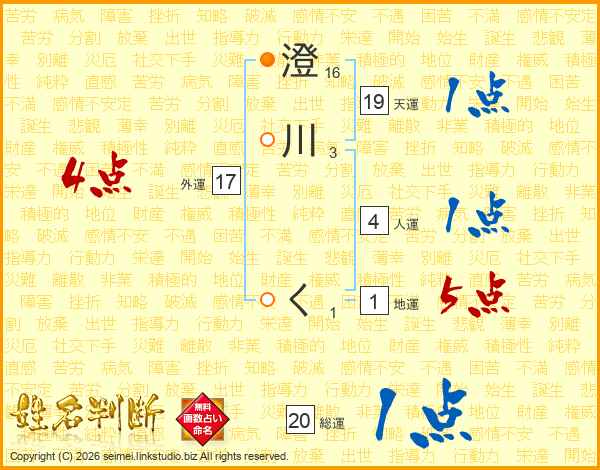 生活面を象徴する運勢です。外部から受ける影響力を表し、結婚運、家庭運や職場、環境への順応性を表します。総運から人運を引いた画数。姓や名が1文字の場合を除く。