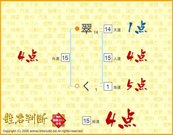 生活面を象徴する運勢です。外部から受ける影響力を表し、結婚運、家庭運や職場、環境への順応性を表します。総運から人運を引いた画数。姓や名が1文字の場合を除く。