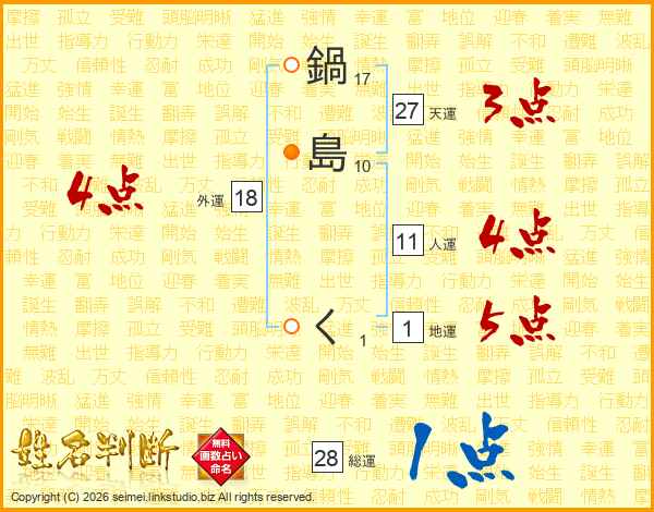 生活面を象徴する運勢です。外部から受ける影響力を表し、結婚運、家庭運や職場、環境への順応性を表します。総運から人運を引いた画数。姓や名が1文字の場合を除く。