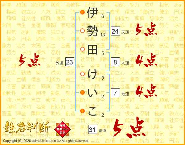 伊(6画)勢(13画)田(5画) け(3画)い(2画)こ(2画)