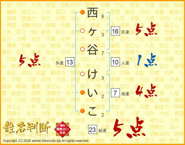 西(6画)ヶ(3画)谷(7画) け(3画)い(2画)こ(2画)