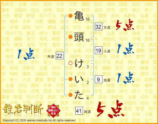 亀(16画)頭(16画) け(3画)い(2画)た(4画)
