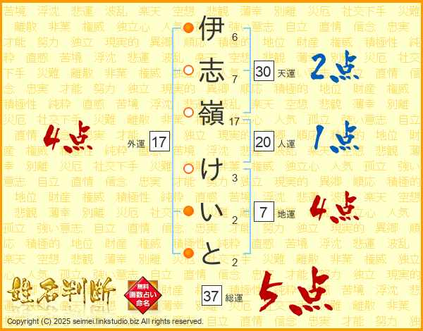 伊(6画)志(7画)嶺(17画) け(3画)い(2画)と(2画)