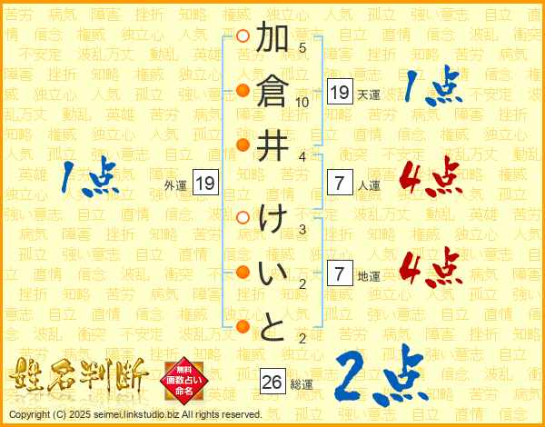 生活面を象徴する運勢です。外部から受ける影響力を表し、結婚運、家庭運や職場、環境への順応性を表します。総運から人運を引いた画数。姓や名が1文字の場合を除く。