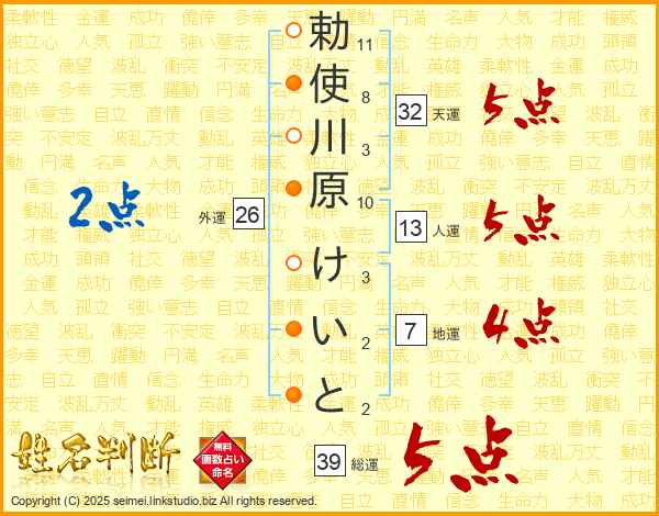 生活面を象徴する運勢です。外部から受ける影響力を表し、結婚運、家庭運や職場、環境への順応性を表します。総運から人運を引いた画数。姓や名が1文字の場合を除く。