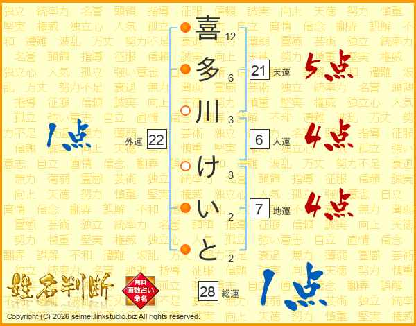 喜(12画)多(6画)川(3画) け(3画)い(2画)と(2画)