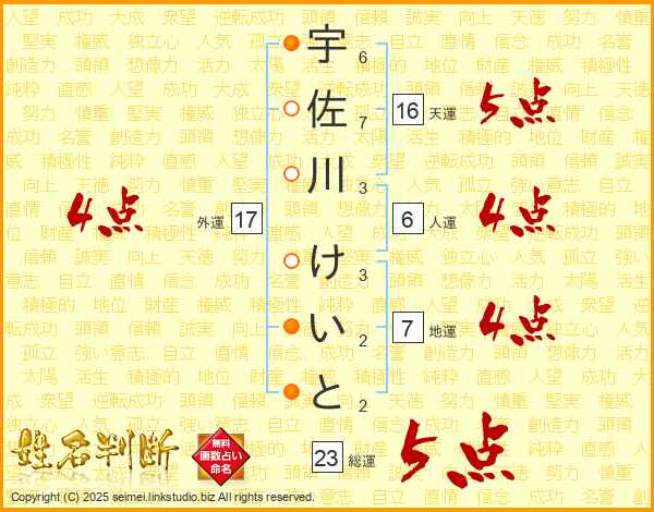 宇(6画)佐(7画)川(3画) け(3画)い(2画)と(2画)