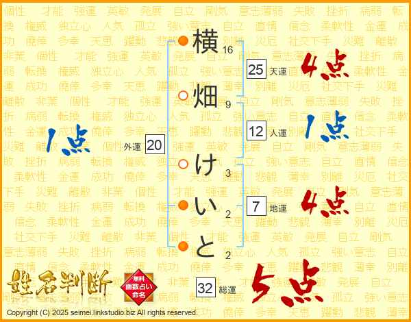 生活面を象徴する運勢です。外部から受ける影響力を表し、結婚運、家庭運や職場、環境への順応性を表します。総運から人運を引いた画数。姓や名が1文字の場合を除く。