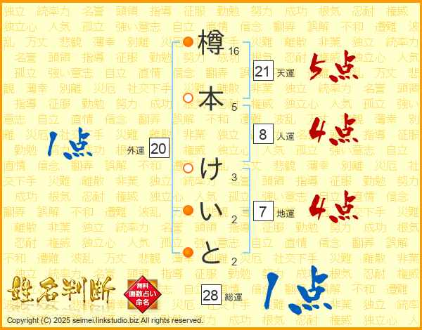 樽本けいとさんの天運は21画の5点!