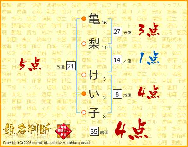 亀梨けい子さんの総運は35画の4点!