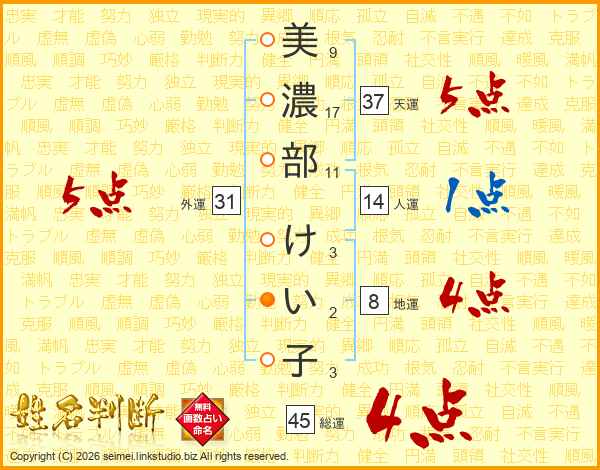 美(9画)濃(17画)部(11画) け(3画)い(2画)子(3画)