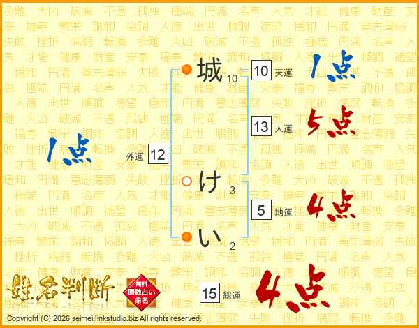生活面を象徴する運勢です。外部から受ける影響力を表し、結婚運、家庭運や職場、環境への順応性を表します。総運から人運を引いた画数。姓や名が1文字の場合を除く。