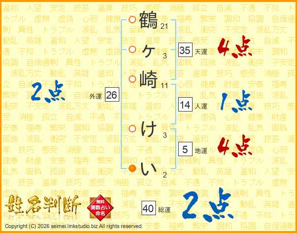 鶴ヶ崎けいさんの外運は26画の2点!