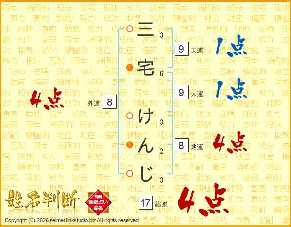 三(3画)宅(6画) け(3画)ん(2画)じ(3画)