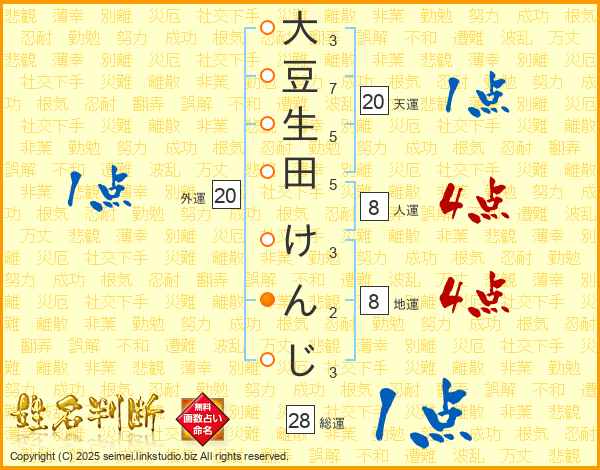 大(3画)豆(7画)生(5画)田(5画) け(3画)ん(2画)じ(3画)