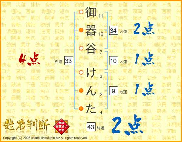 御(11画)器(16画)谷(7画) け(3画)ん(2画)た(4画)