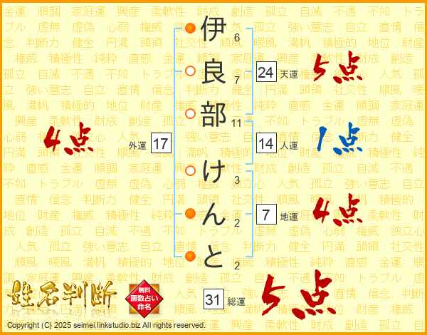 伊(6画)良(7画)部(11画) け(3画)ん(2画)と(2画)