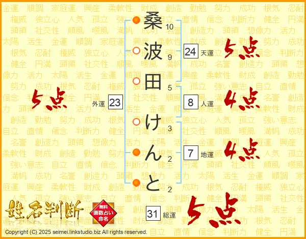 桑(10画)波(9画)田(5画)  け(3画)ん(2画)と(2画)