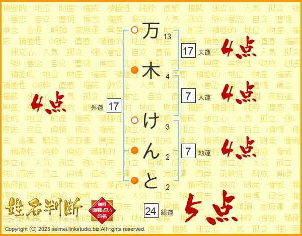 万(13画)木(4画) け(3画)ん(2画)と(2画)
