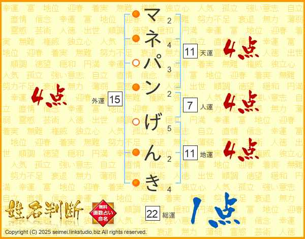 生活面を象徴する運勢です。外部から受ける影響力を表し、結婚運、家庭運や職場、環境への順応性を表します。総運から人運を引いた画数。姓や名が1文字の場合を除く。