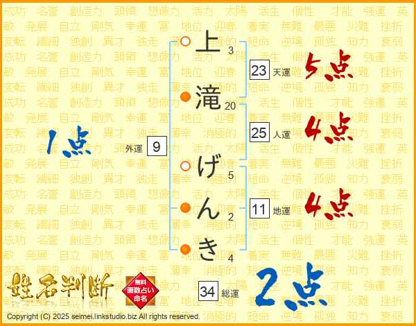 上(3画)滝(20画) げ(5画)ん(2画)き(4画)
