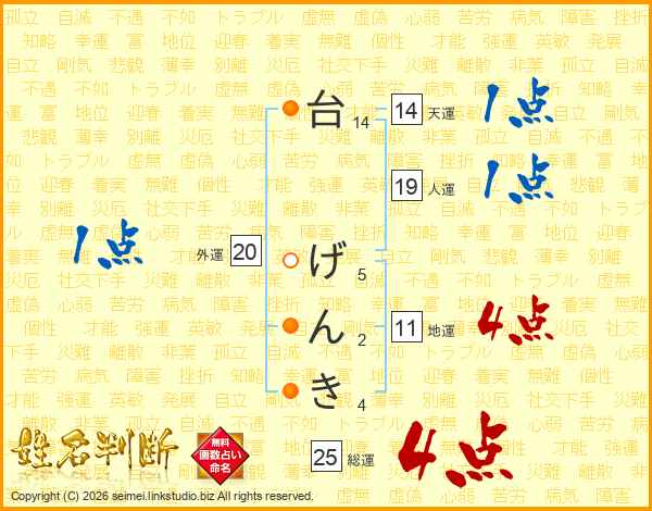 生活面を象徴する運勢です。外部から受ける影響力を表し、結婚運、家庭運や職場、環境への順応性を表します。総運から人運を引いた画数。姓や名が1文字の場合を除く。