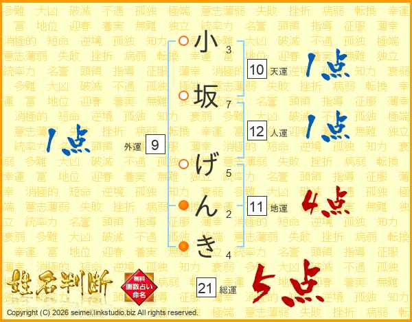小(3画)坂(7画) げ(5画)ん(2画)き(4画)