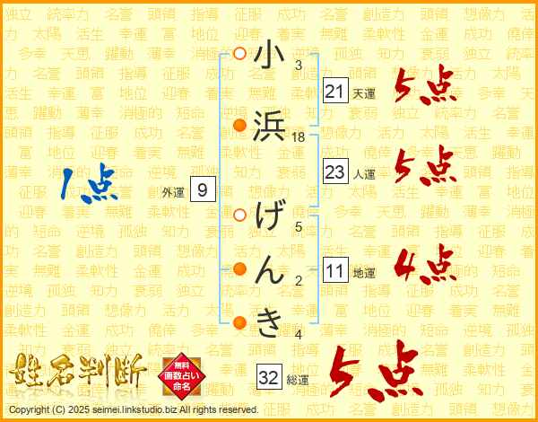 小(3画)浜(18画) げ(5画)ん(2画)き(4画)