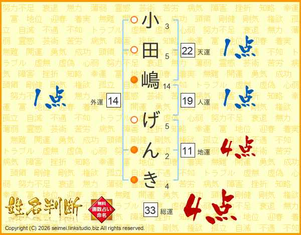 小(3画)田(5画)嶋(14画) げ(5画)ん(2画)き(4画)