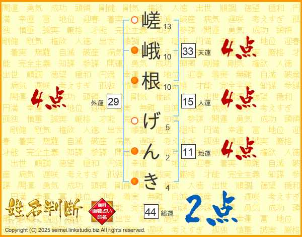 嵯(13画)峨(10画)根(10画) げ(5画)ん(2画)き(4画)