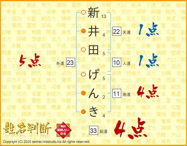 新(13画)井(4画)田(5画) げ(5画)ん(2画)き(4画)