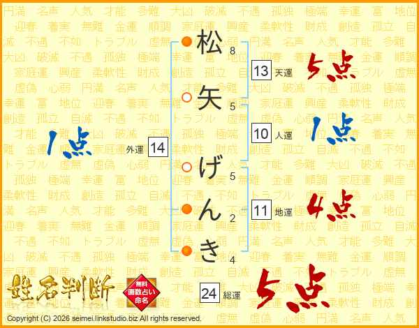 松(8画)矢(5画) げ(5画)ん(2画)き(4画)