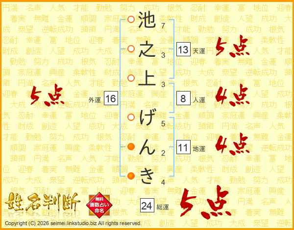 池(7画)之(3画)上(3画) げ(5画)ん(2画)き(4画)