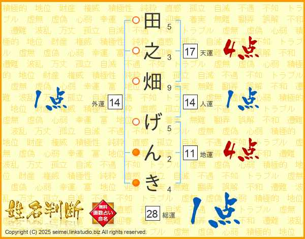 生活面を象徴する運勢です。外部から受ける影響力を表し、結婚運、家庭運や職場、環境への順応性を表します。総運から人運を引いた画数。姓や名が1文字の場合を除く。