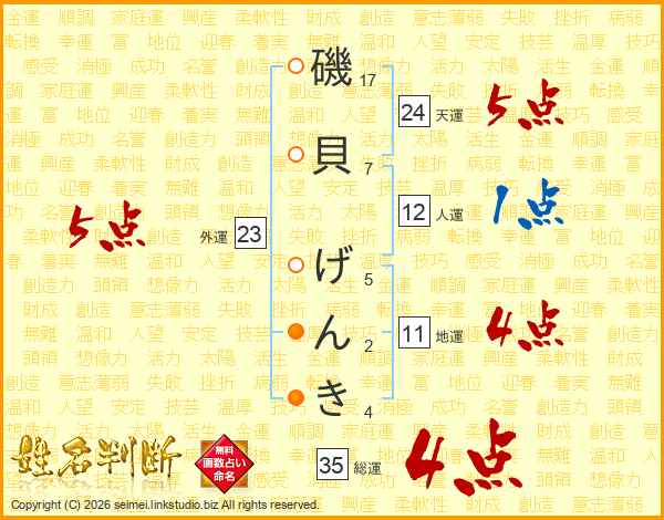 磯(17画)貝(7画) げ(5画)ん(2画)き(4画)
