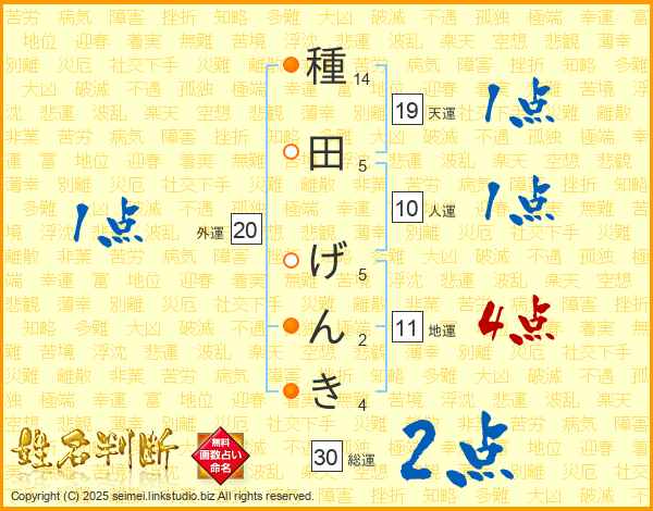 種(14画)田(5画) げ(5画)ん(2画)き(4画)