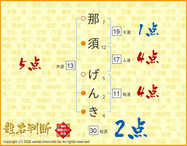 那(7画)須(12画) げ(5画)ん(2画)き(4画)