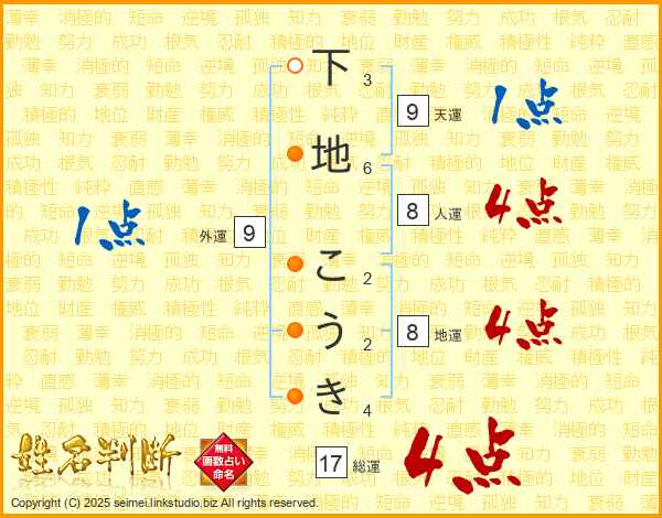 生活面を象徴する運勢です。外部から受ける影響力を表し、結婚運、家庭運や職場、環境への順応性を表します。総運から人運を引いた画数。姓や名が1文字の場合を除く。