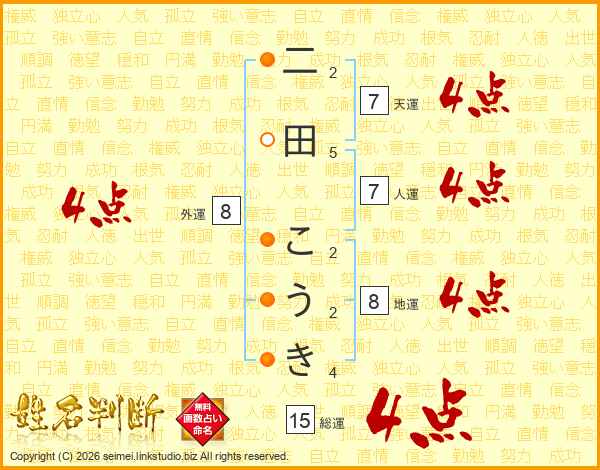 二田こうきさんの総運は15画の4点!