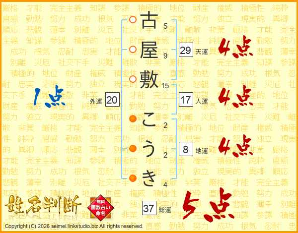 古(5画)屋(9画)敷(15画) こ(2画)う(2画)き(4画)