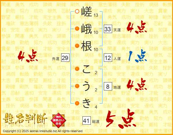 嵯峨根こうきさんの総運は41画の5点!