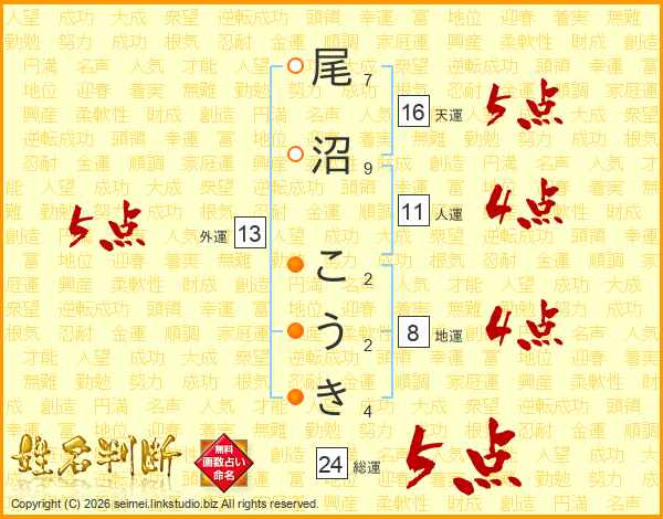 尾(7画)沼(9画) こ(2画)う(2画)き(4画)