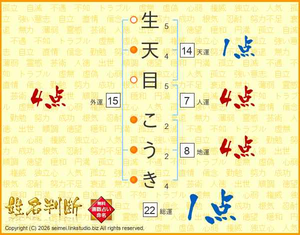 生(5画)天(4画)目(5画) こ(2画)う(2画)き(4画)