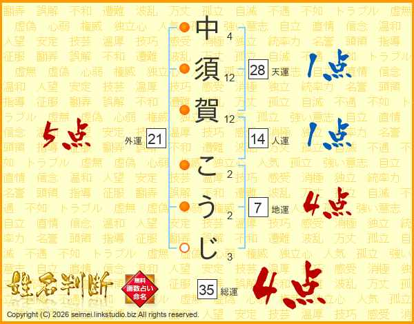 中(4画)須(12画)賀(12画) こ(2画)う(2画)じ(3画)