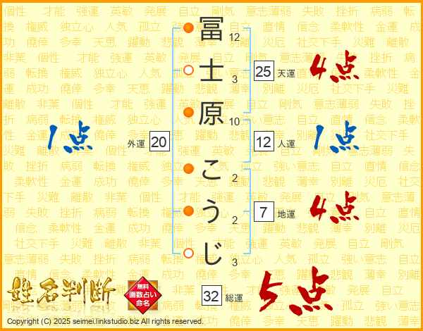 生活面を象徴する運勢です。外部から受ける影響力を表し、結婚運、家庭運や職場、環境への順応性を表します。総運から人運を引いた画数。姓や名が1文字の場合を除く。