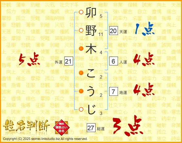 卯(5画)野(11画)木(4画) こ(2画)う(2画)じ(3画)