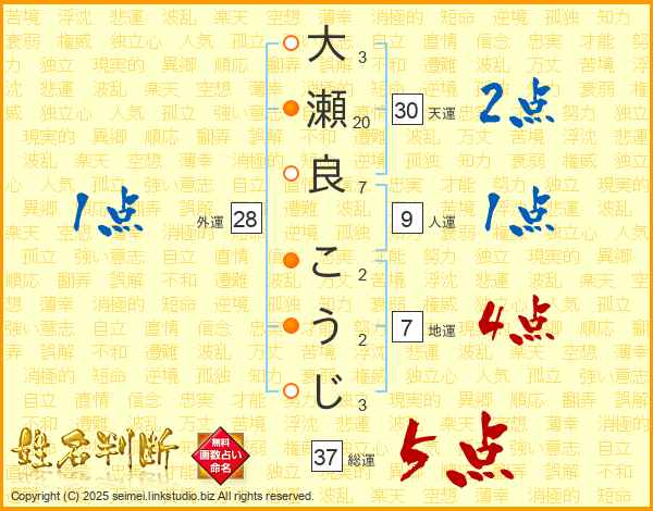 大(3画)瀬(20画)良(7画) こ(2画)う(2画)じ(3画)