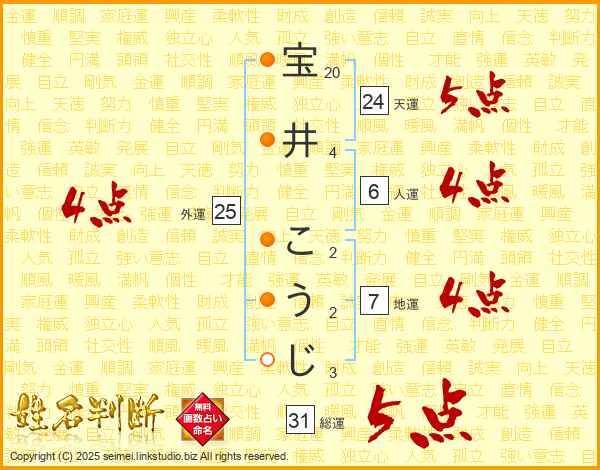宝井こうじさんの外運は25画の4点!